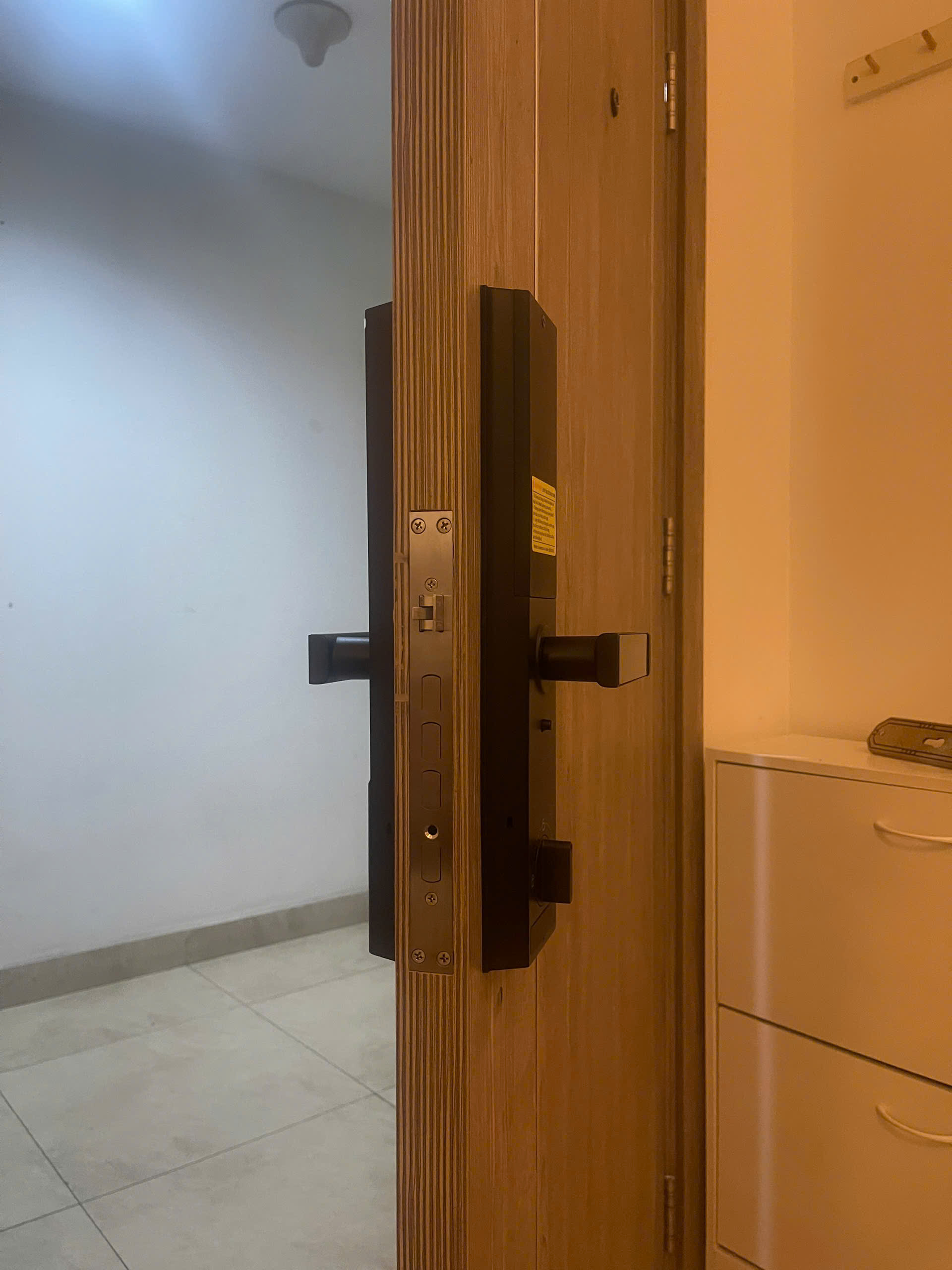 Với thiết kế đen tinh tế, thân khóa bằng hợp kim nhôm đúc nguyên khối, sản phẩm không chỉ đảm bảo độ bền chắc mà còn hài hòa với kiến trúc nội thất cao cấp tại các căn hộ nơi đây.